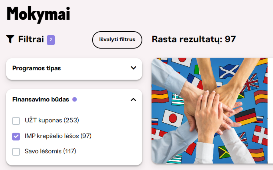 Mokymus, kurie finansuojami IMP/Kursuok krepšelio lėšomis, galite rasti pasinaudodami svetainėje esančiu finansavimo filtru (žr. iliustraciją).