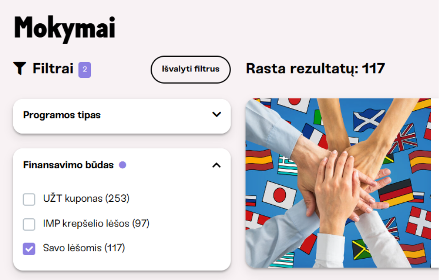 Kursuok.lt skiltyje „Mokymai“ pasirinkite filtrą „Savo lėšomis“, išsirinkite programą ir pradėkite mokytis tada, kai jums patogiausia (žr. iliustraciją žemiau).