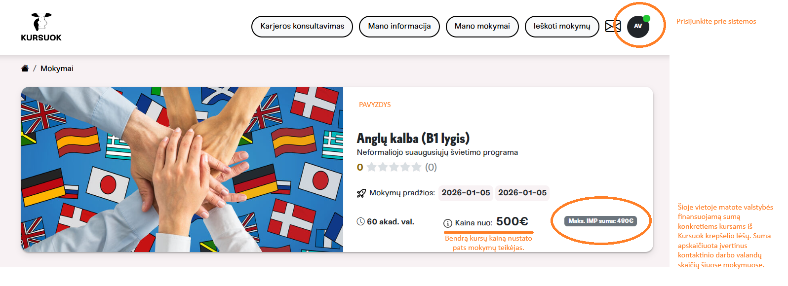 Atkreipiame dėmesį, kad Kursuok.lt svetainėje yra pateikiamos bendros mokymų kainos, o tikslią kainą bei sumą, kurią finansuoja valstybė, pamatysite tik prisijungę prie sistemos per el. valdžios vartus ir pasirinkę finansavimo būdą.